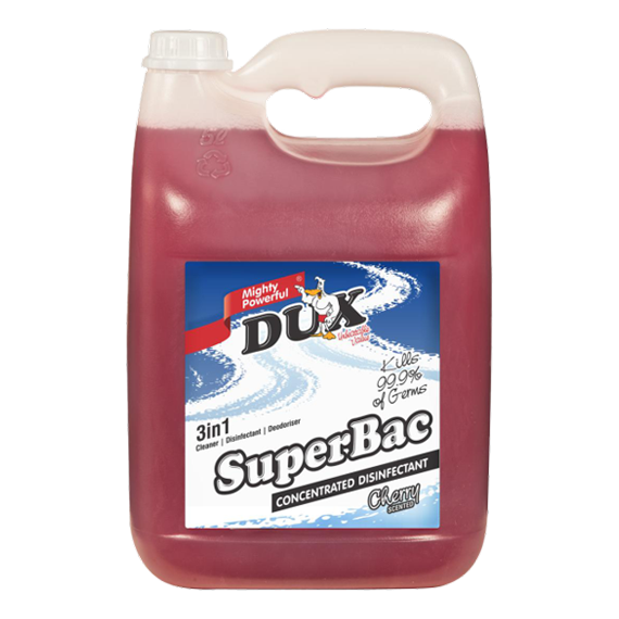 A superior 3-in-1 ultra concentrated disinfectant, deodoriser and all purpose cleaner with a long lasting Lavender fragrance. It effectively kills most common germs and bacteria, leaving surfaces in your home clean and germ free. DUX SUPERBAC CHERRY is a highly effective disinfectant and all purpose cleaner, designed to be used on all hard surfaces such as floors, walls, toilets, urinals, sanitary bins, refuse bins and so much more. Its unique chemical composition assists in fast neutralisation of unpleasant odours and effective sanitising all in one operation. DUX SUPERBAC CHERRY does not contain any bleaches, alcohol or ammonia, making it a great non toxic, environmentally friendly cleaner, disinfectant and deodoriser.