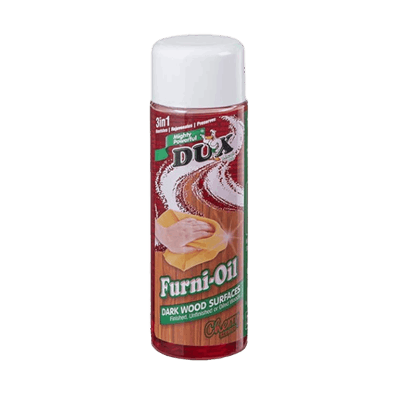 DUX FURNI-OIL is a state of the art wood polish specially formulated to be used on dark woods such as mahogany, walnut, teak, cherry and rosewood. It serves as a protective coating for most types of wood's currently in use. When using DUX FURN I-OIL you protect your furniture against changes in the woods colour as well as preventing scratching, cracking and splitting. A superior maintenance furniture polish used to enhance the depth, tone and natural beauty of the wood grain every time you polish or dust. DUX FURN I-OIL has excellent penetration properties and therefore ensures a hard-wearing, dirt and water resistant surface. DUX FURNI-OIL was specially formulated to be used on DARK wood species, as it will bring out your wood's natural beauty, intensifies the dark colour without drying the wood finish. DUX FURN I-OIL is not recommended for use on floors. DUX FURNI-OIL leaves no wax build-up, only a nice shine and a fresh cherry scent. It does not contain wax, silicone oil or linseed oil.